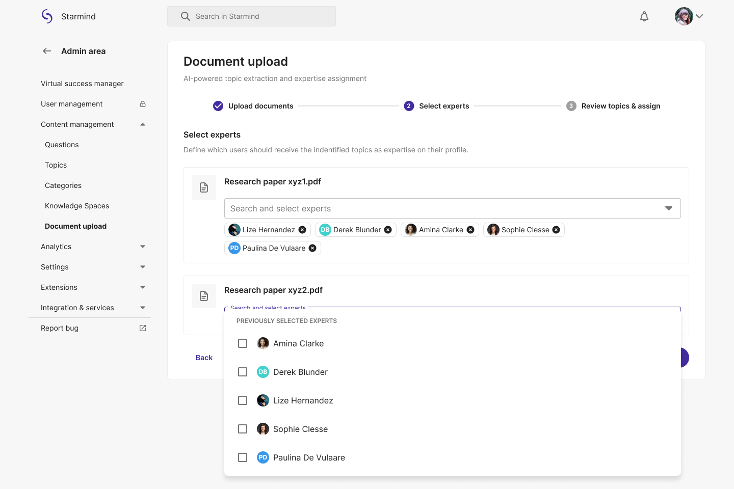 - You'll now see a list of the documents you've uploaded. For each one, use the Select experts dropdown to search for and choose the users who should receive the extracted topics as expertise on their profile.