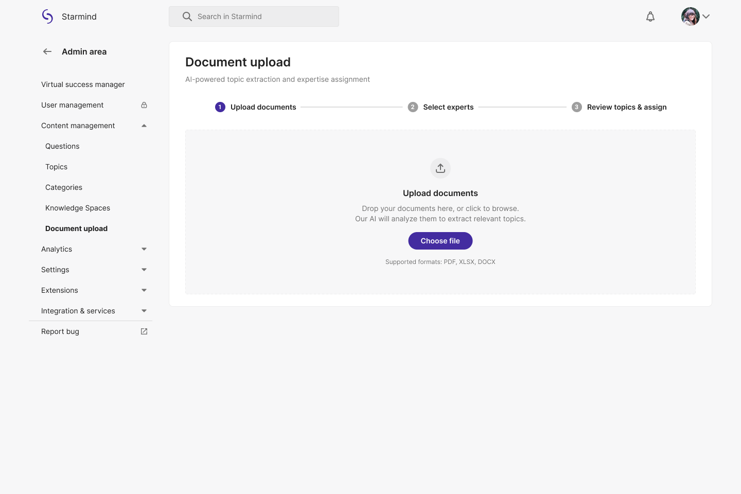 Document Upload lets you upload files directly into Starmind. Our AI will automatically scan the content, extract relevant topics, and assign them as expertise to the users you choose. It's a quick way to improve expertise profiles without users having to do it manually.